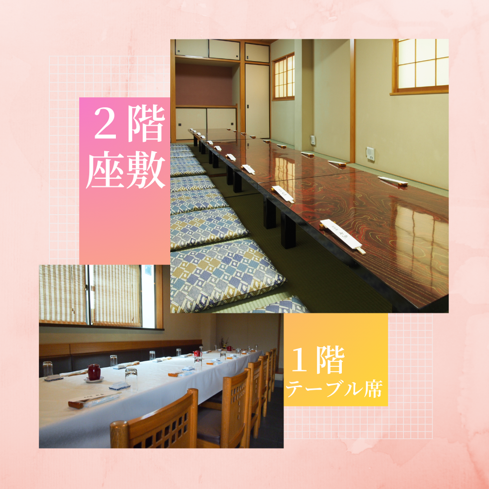 お席: 2階にはお座敷を、1階には足の不自由なお客様にも好評なテーブル席をご用意しております。
