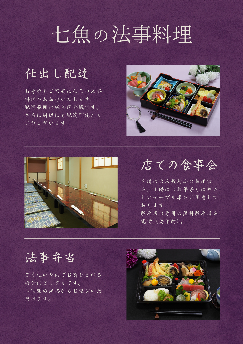 ご法事予定の施主様、七魚の法事料理をご検討よろしくお願いいたします。